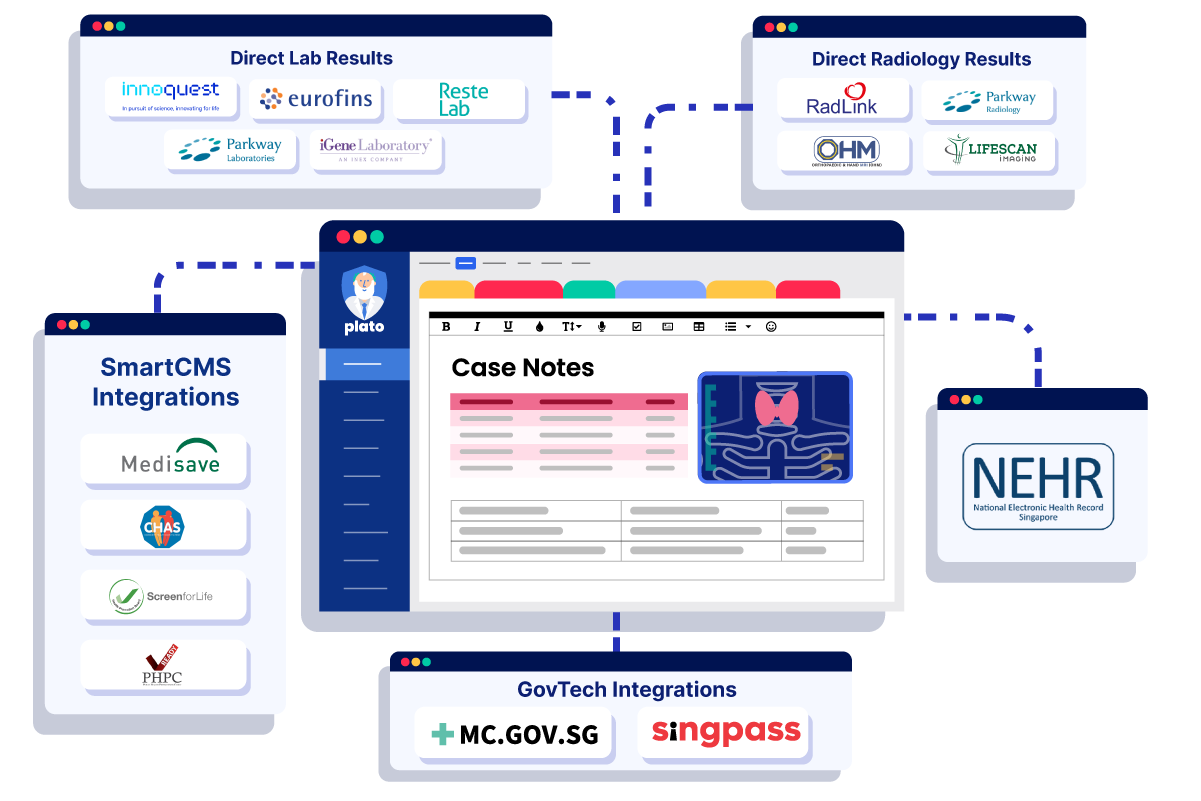Let your doctors and front desk team manage all SmartCMS services, get lab/radiology results, and make NEHR submissions, directly from Plato. For example, your doctors can directly submit data to the National Immunisation Registry (NIR) without leaving their Plato EMR. At your front desk, staff can check claims and manage direct submissions to CHAS, Medisave, and Screen for Life (SFL) from Plato. Since your doctors get direct lab/radiology results in their Plato EMR, your team no longer has to scan any results, saving them time and effort. If your clinic is ready to voluntarily contribute to Singapore’s National Electronic Health Record (NEHR) system, it can choose to opt in through Plato, then manage NEHR submissions directly from the platform. As a forward-thinking practice management software, Plato had prepared its clinics for the introduction of NEHR early on, by becoming the first private clinic software to complete linkage with NEHR. Plato continuously builds and maintains key integrations for its healthcare providers, simplifying work for your clinic team and ensuring your practice keeps pace with all regulatory updates.